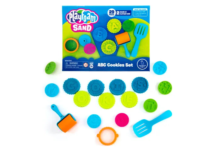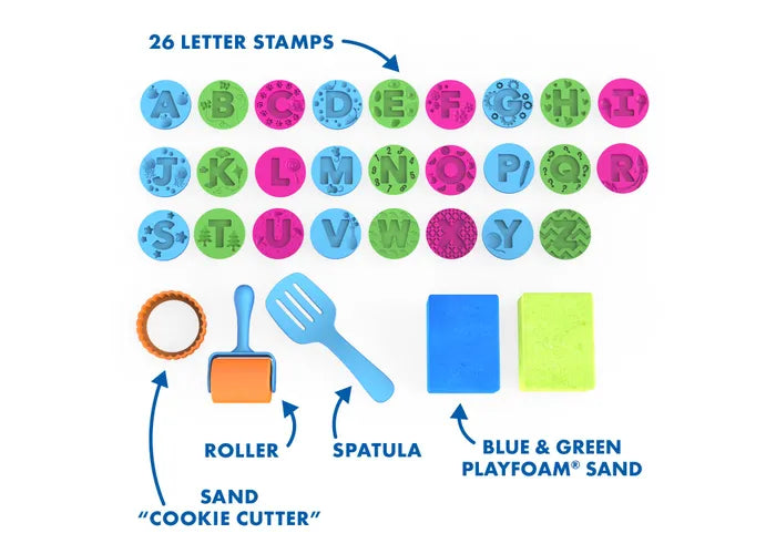 - Includes 2 8-ouce packs of Playfoam Sand, cookie cutter, 26 letter stamps, spatula, and roller